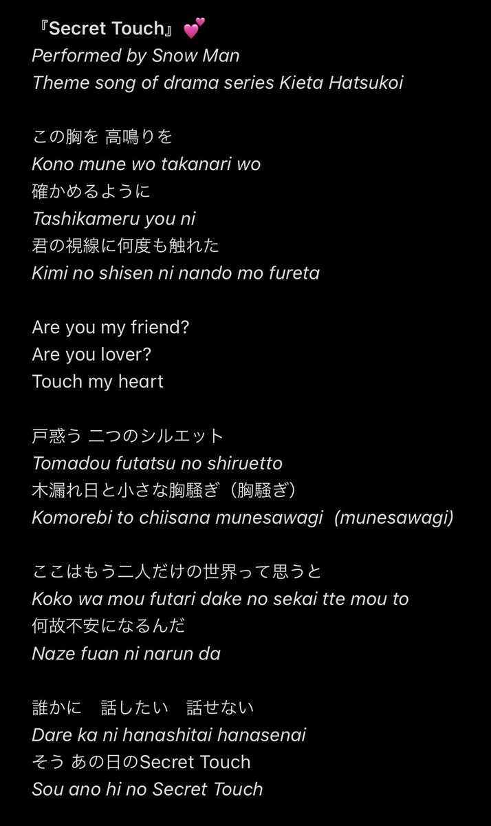 Secret Touch Performed By Snow Man Theme Song Of Drama Series Kieta Hatsukoi Kanji And Romaji Lyricspictwittercomskgwz0bsva - Loverinnnix Cocotbodol