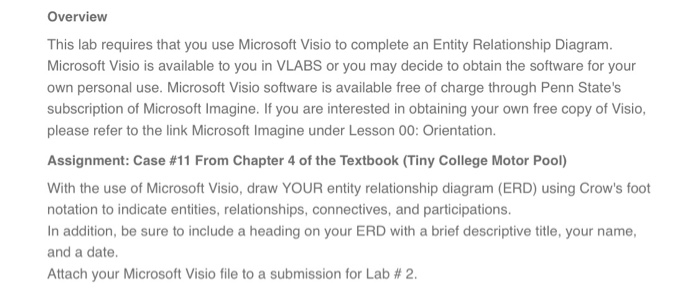 Overview this lab requires that you use microsoft visio to complete an entity relationship diagram. This is done in advance of, and during, the first 2 weeks of every semester. Canvas login for penn state students, employees and friends of penn state