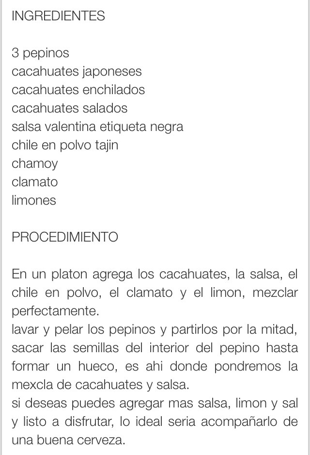 Pepinos locos (crazy cucumbers) is a very unique and delicious mexican snack made with fresh cucumbers, fruit and chips. If that's not enough to impress your tastebuds, don't forget valentina hot. Cacahuates con realito, pepino, jicama, limon, chile empolvo y chamoy.